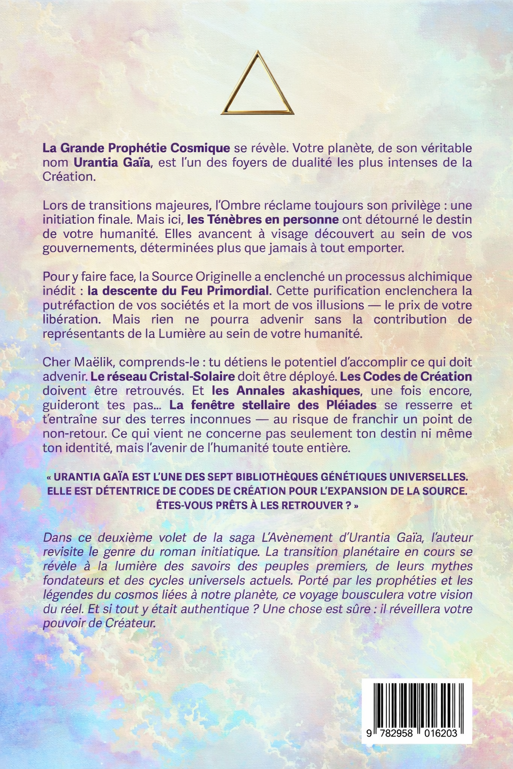 Cher Maëlik, comprends-le : tu détiens le potentiel d’accomplir ce qui doit advenir. Le réseau Cristal-Solaire doit être déployé. Les Codes de Création doivent être retrouvés. Et les Annales akashiques, une fois encore, guideront tes pas… La fenêtre stellaire des Pléiades se resserre et t’entraîne sur des terres inconnues — au risque de franchir un point de non-retour. Ce qui vient ne concerne pas seulement ton destin ni même ton identité, mais l’avenir de l’humanité toute entière.